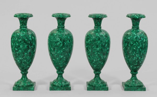 Satz von vier großen feinen Malachit-Balustervasen Flächendeckender Fond aus außerordentlich fein gemasertem Malachit. Gestreckter, olivförmiger Korpus mit schlankem Vasenhals sowie leicht vorkragendem, profiliertem Lippenrand auf korrespondierender Basis. In der Vasenmündung knaufförmige Verschraubung aus Bronze. Unterhalb quadratische Plinthe. Minim. besch.; H. 71,5 cm.