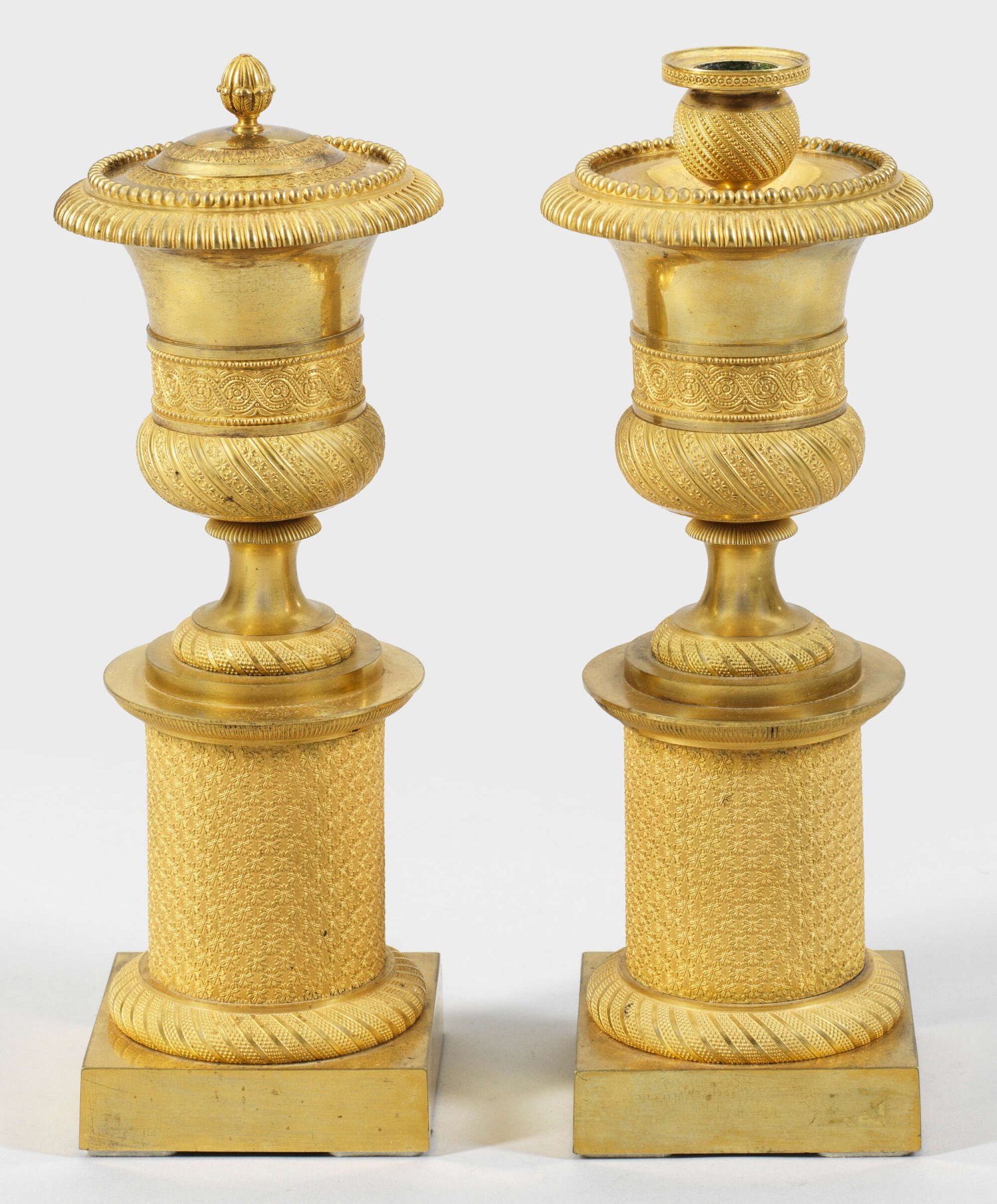Paar Empire-Cassolettes 1-flg.; Bronze, vergoldet. Über quadratischer Plinthe zylinderförmiger Schaft, umlaufend mit fein reliefiertem Blütendekor im Rapport. Oberhalb balusterförmige Kratervase mit weit ausschwingendem, godroniertem Lippenrand. Flacher oberer Abschluss mit Pinienknauf bzw. vasenförmiger Tülle. H. 28 cm.