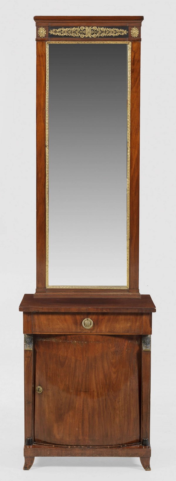 Empire-Konsolschrank mit Pfeilerspiegel Mahagoni, furniert. Gerader, hochrechteckiger Korpus auf ausgestellten Füßen. In der Front bombierte Tür, flankiert von eingestellten Karyatiden sowie vorkragendes Schubfach. Hochrechteckige Spiegelrahmung mit Palmettenfries sowie schmalem Giebelfeld mit applizierten Rosenblüten aus Messingblech. Schrank-H. 85 cm. 69 cm x 44 cm. Spiegel: 149 cm x 42,5 cm.
