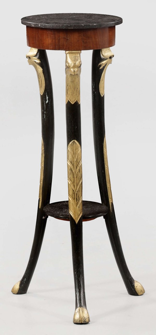 Empire-Gueridon Mahagoni, furniert sowie Holz, geschnitzt, gefasst und teilw. vergoldet. Bombierte Zarge auf gebogten Beinen aus stilisierten Greifen als Träger für runde Deckplatte und korrespondierendes Ablagefach aus dunkelgrauem Marmor. H. 89 cm.