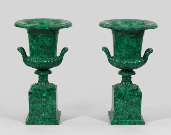 Paar große äußerst repräsentative Malachit-Kratervasen Flächendeckender Fond aus außerordentlich fein gemasertem Malachit. Balusterförmiger, umlaufend godronierter Vasenkorpus, seitlich mit hochaufgeworfenen, gerundeten Handhaben sowie weit ausschwingendem, profiliertem Lippenrand auf kanneliertem Rundfuß nach dem berühmten Vorbild der sog. Medici-Vase. Unterhalb rechteckiger Podestsockel mit gekehlter Basis. Minim. besch. H. 84 cm.