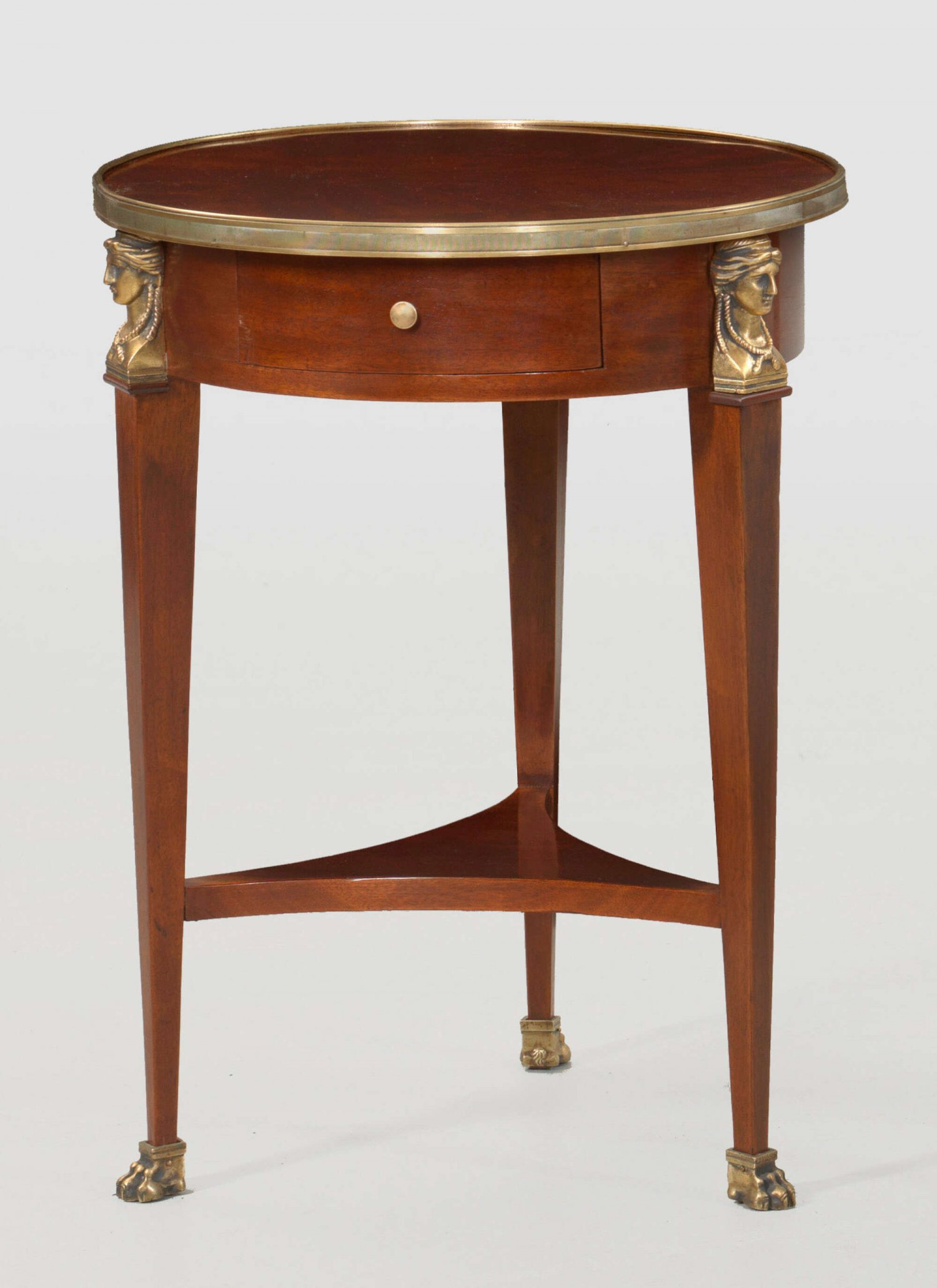 Empire-Beistelltisch Mahagoni, furniert. Bombierter, einschübiger Zargenkasten auf hohen, konischen Vierkantbeinen mit Karyatiden, unterhalb durch dreiseitig konkav eingezogenes Ablagefach verbunden. Gering überstehende, runde, profilgerahmte Deckplatte. H. 74 cm. D. 55 cm.