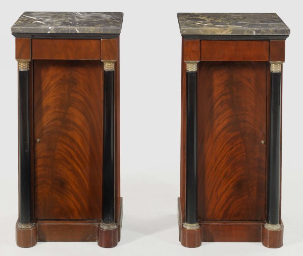 Paar Pfeilerschränke im Empire-Stil Mahagoni, furniert und teilw. ebonisiert. Gerader, hochrechteckiger Korpus, flankiert von eingestellten Vollsäulen. In der Front schmale Tür sowie kleines Schubfach. Gering überstehende Deckplatte aus grau gemasertem Marmor. H. 80 cm. 39 cm x 36 cm.