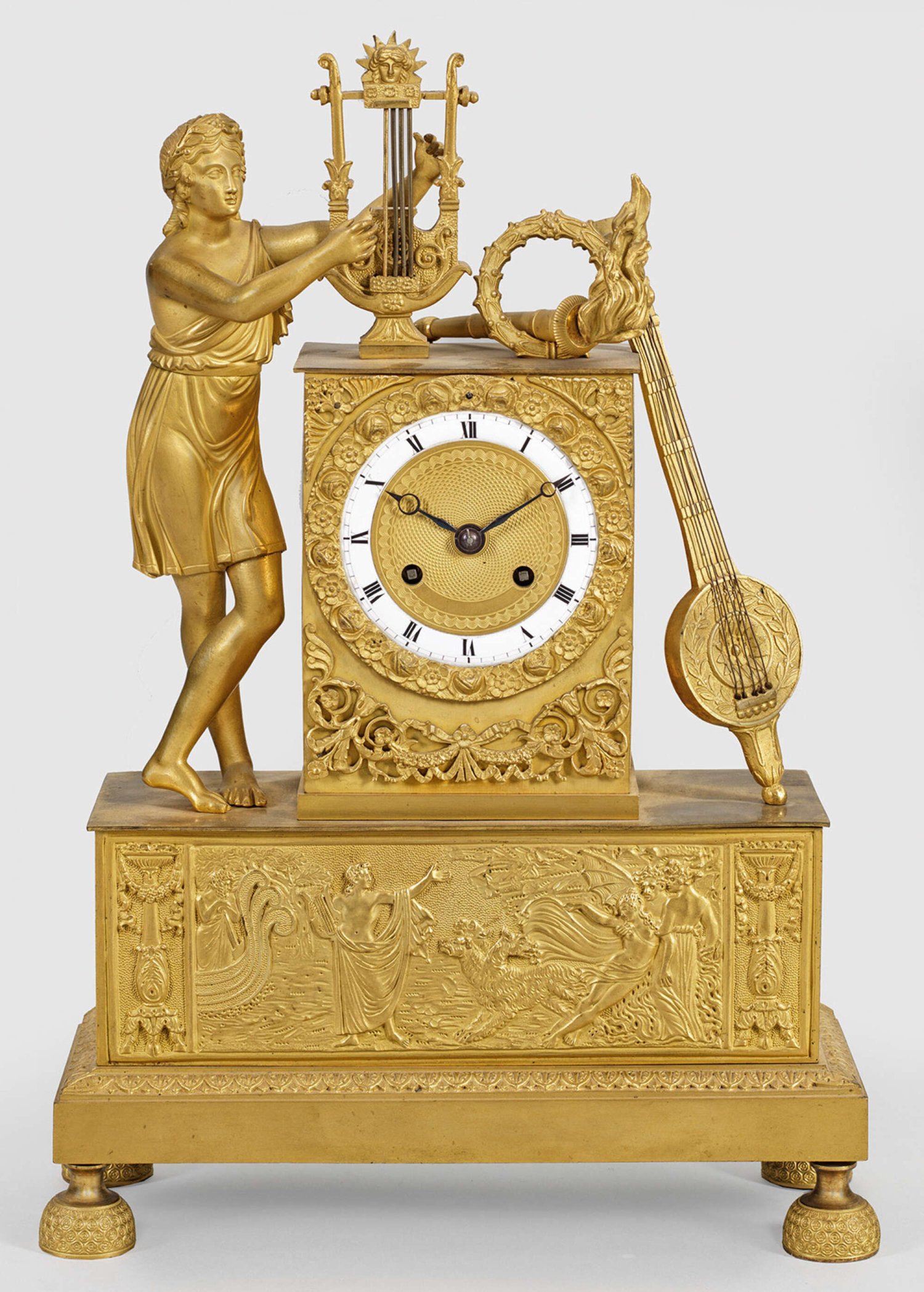 Kleine Empire-Pendule Bronze, vergoldet. Vollplastische Darstellung von Orpheus, die Lyra spielend. Rechteckiges Uhrengehäuse mit Bekrönung in Form einer liegenden Fackel. Unterhalb querrechteckig angelegter Sockel mit erhaben reliefierter Darstellung von Orpheus und Eurydike in der Unterwelt beim dreiköpfigen Hund Cerberus, nachdem Orpheus durch sein Zurückblicken die Befreiung Eurydikes verwirkt hat. Guillochiertes Zifferblatt mit Emailziffernring. Pendulenwerk mit Fadenaufhängung sowie Halbstundenschlag auf Glocke. H. 37 cm. 25 cm x 9 cm.