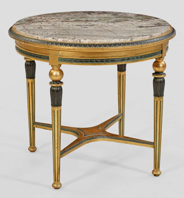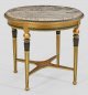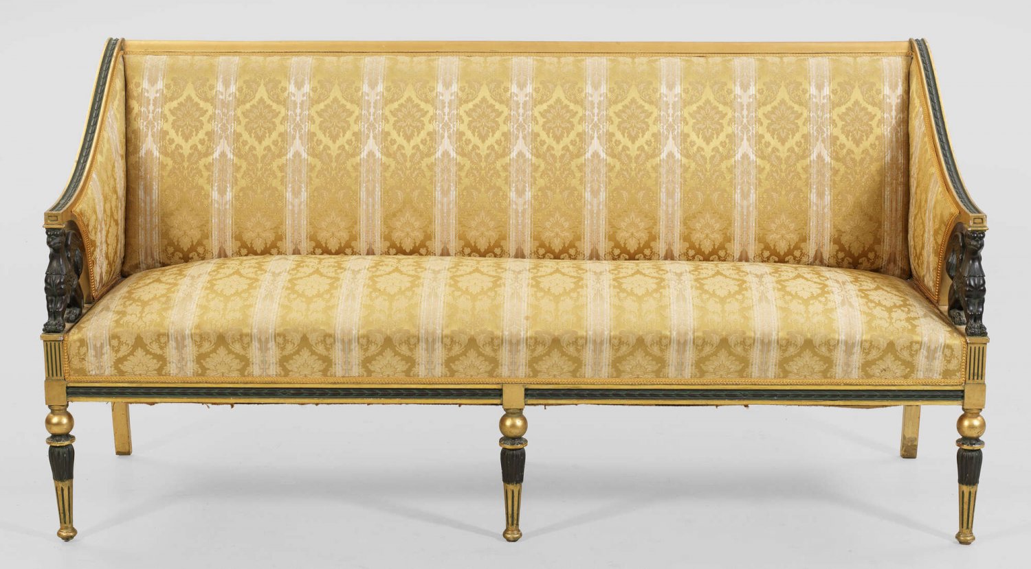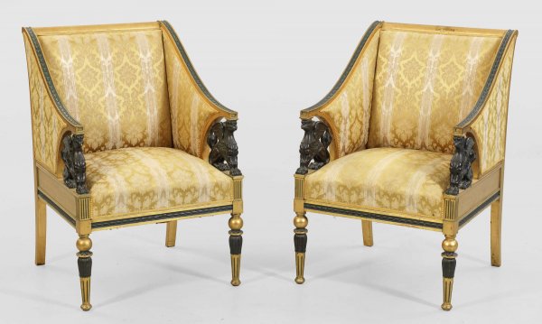 Elegante Empire-Salongarnitur 4-tlg.; Sofa, Paar Sessel und Salontisch. Holz, geschnitzt, dunkel gefasst und teilw. vergoldet. Gerade, profilierte Zarge auf kannelierten Balusterbeinen. Plastisch gearbeitete Chimären als Stützen für schmale, geschweift ansteigende Armlehnen, in leicht zurückschwingende Rückenlehne übergehend. Allseitig gepolstert und bezogen. Korrespondierender Salontisch mit hellgrauer, dunkelgrün und bordeauxrot gemaserter Marmorplatte. Sofa-H. 94 cm. 181 cm x 71 cm. Sitz-H.47 cm. Tisch-H. 76. D. 85 cm.