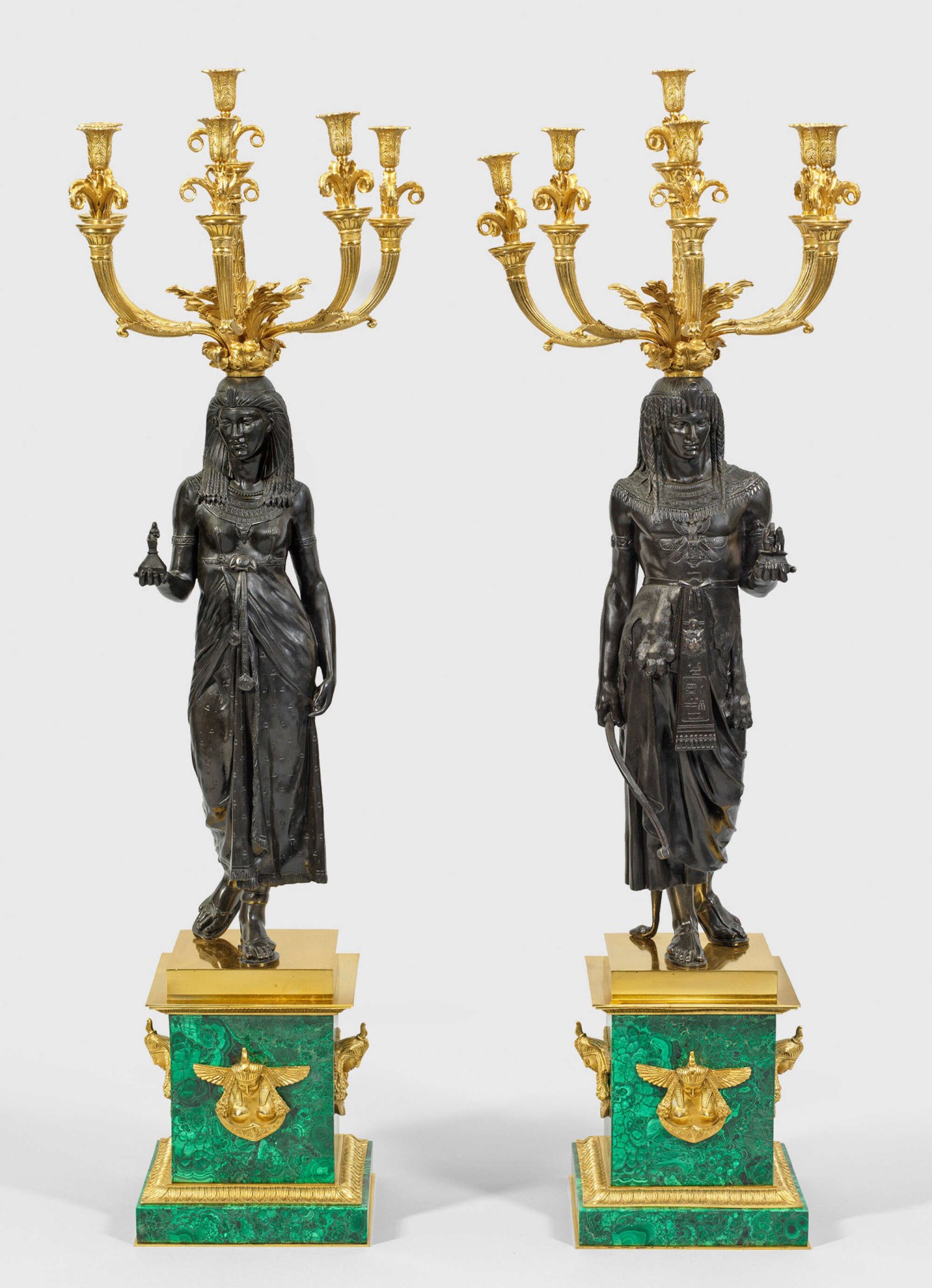 Paar monumentale Skulpturenleuchter im Empire-Stil Gegenstücke. 6-flg.; Bronze, dunkel patiniert bzw. vergoldet sowie flächendeckendes Malachitfurnier. Vollplastische Darstellung eines Pharaonenpaares als Träger für Leuchtmittel in Form von stark geschwungenen, blattreliefierten Leuchterarmen mit hohen, vasenförmigen Tüllen über Volutenelementen. Unterhalb hoher, profilierter Podestsockel mit Palmettenfries sowie schauseitig erhaben reliefierten Pharaonenköpfen. H. 131 cm.
