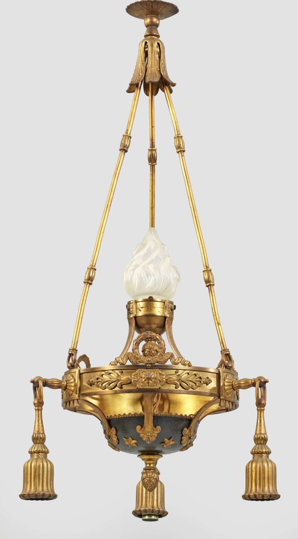 Kleine Deckenlampe im Louis XVI-Stil 4-flg.; Messing und farbloses, satiniertes Glas. Offen gestalteter Korpus aus schmalem Reif sowie kuppelförmigem unteren Abschluss mit hohem, flammenförmigen Lampenschirm. Kurze Leuchterarme mit kelchförmigen Lampenfassungen. Schräg gestellte Streben sowie blattreliefierter oberer Abschluss. Elektrifiziert. H. 78 cm. D. 34 cm.