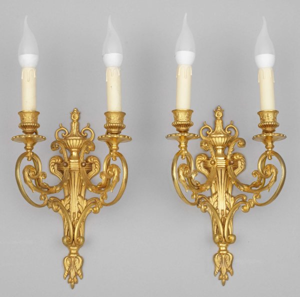 Paar Wandappliken im Louis XVI-Stil 2-flg.; Bronze, vergoldet. Flaches. köcherförmiges Wandschild mit Vasenbekrönung. Davon ausgehend stark geschwungene Leuchterarme aus gegeneinander gestellten Voluten mit vasenförmigen Tüllen. Elektrifiziert. H. 40 cm.