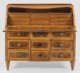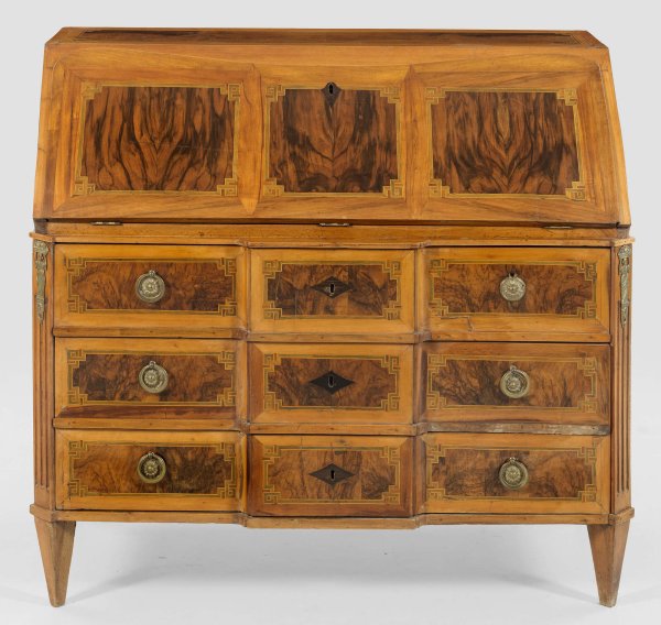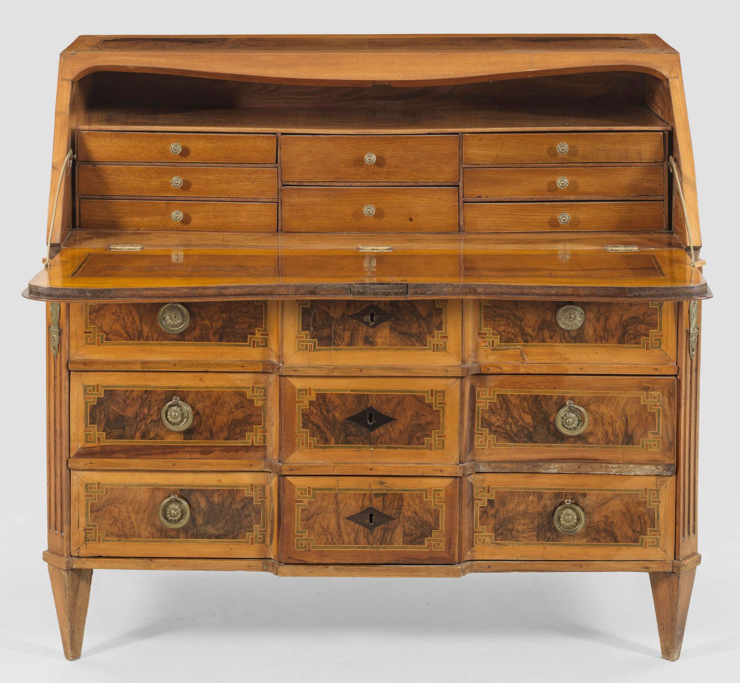 Große Louis XVI-Schreibkommode Nussbaum und Nussbaummaser, furniert sowie Einlagen aus teilw. grün gefärbtem Ahorn. Gerader, querrechteckig angelegter Korpus, flankiert von schräggestellten, kannelierten Ecklisenen auf konischen Vierkantbeinen. In der gegliederten Front drei breite Schubladen, durch flachen Mittelrisalit verbunden. Oberhalb schräggestellte, abklappbare Arbeitsfläche. Dahinter Schubladeneinteilung. Schauseitig breit gerahmte Furnierfelder, von Bandeinlagen begrenzt. H. 115 cm. 123 cm x 59 cm.