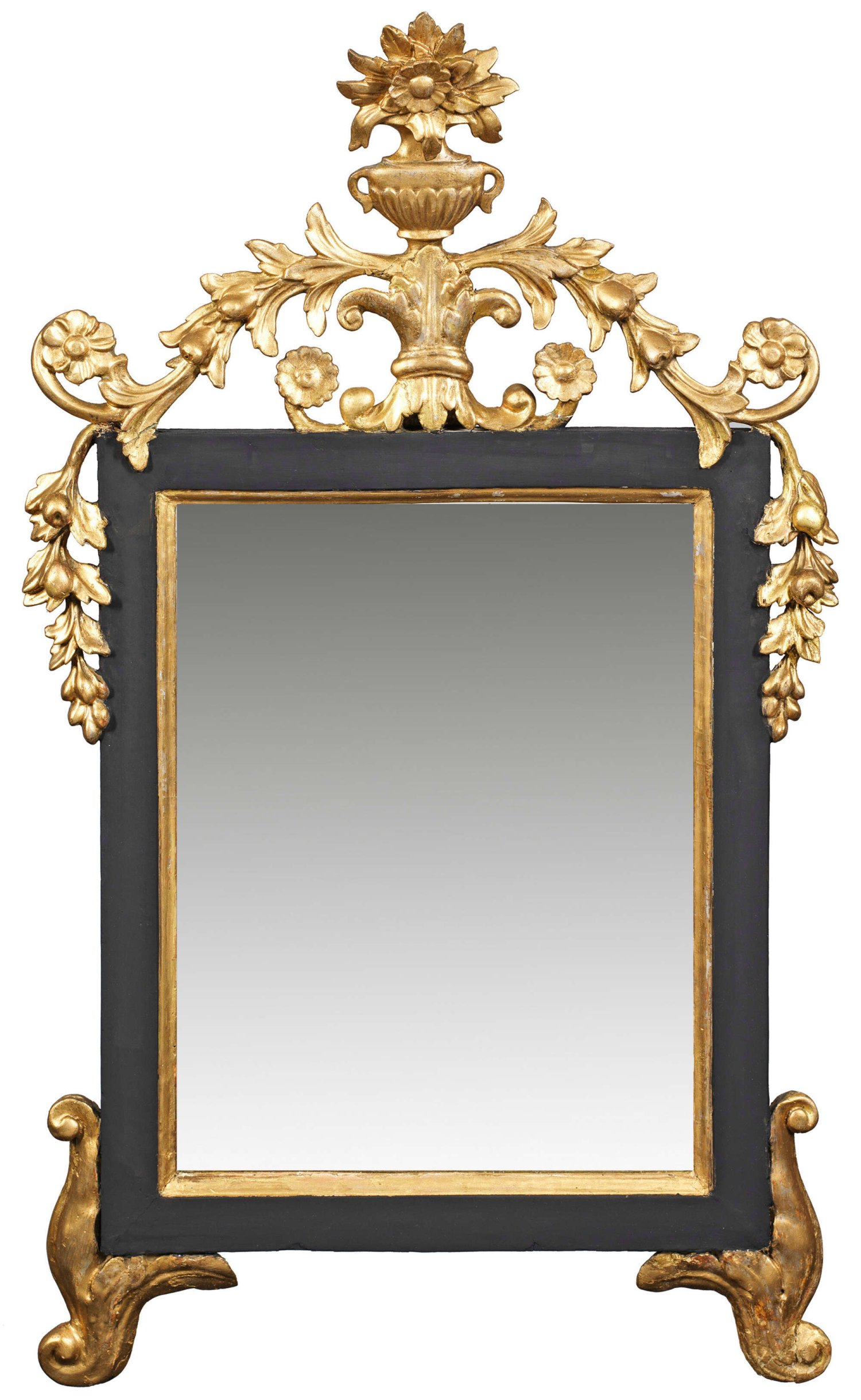 Louis XVI-Wandspiegel Holz, mattschwarz gefasst sowie teilw. geschnitzt, gefasst und vergoldet. Gerade, hochrechteckige Spiegelrahmung auf Volutenfüßen. Hoch aufgeworfene, durchbrochen gearbeitete Spiegelrahmung aus zentralem Vasenmotiv, eingerollten Blattvoluten und Blüten. Rest.; 103 cm x 60 cm.