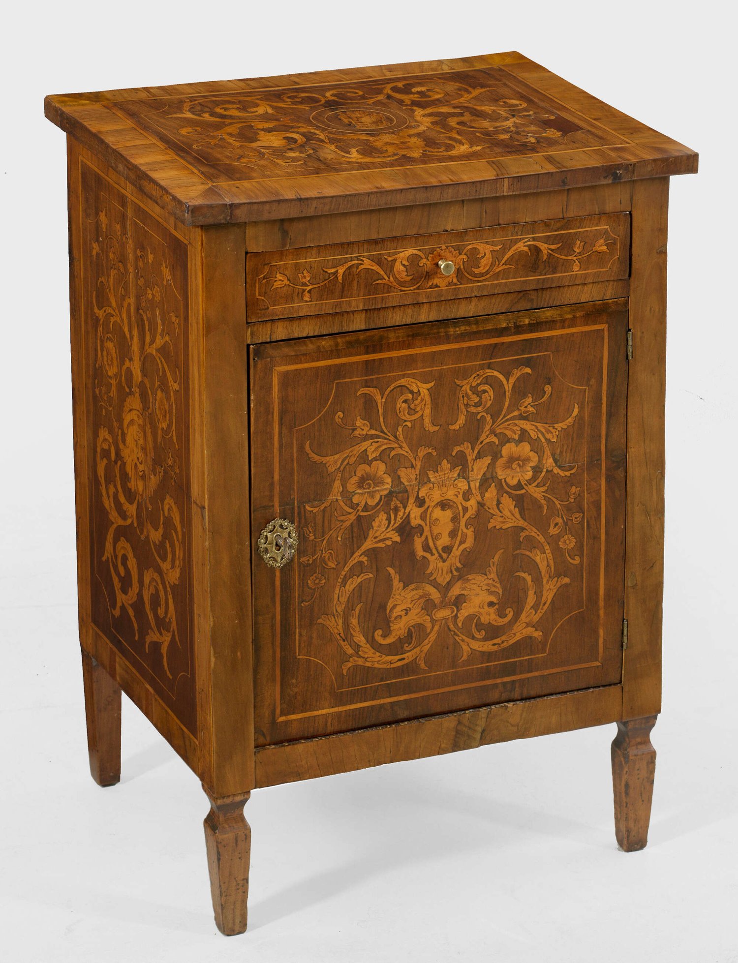 Louis XVI-Pfeilerschränkchen Nussbaum furniert sowie Einlagen aus Obstholz. Gerader, hochrechteckiger Korpus auf konischen, gekanteten Füßen. In der Front eine Tür sowie schmales Schubfach. Gering überstehende Deckplatte. Flächendeckend breit gerahmte Furnierfelder mit üppigen Blattvoluten und Arabesken, von Bandeinlagen begrenzt. H. 75 cm. 54,5 cm x 40 cm.