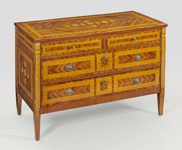 Louis XVI-Kommode Nussbaum, furniert sowie Einlagen aus unterschiedlichen Edelhölzern wie u. a. Ahorn und Rosenholz. Gerader, querrechteckiger Korpus auf konischen Vierkantbeinen. In der gegliederten Front vier Schubladen unterschiedlicher Größe. Dem Korpus entsprechende, gering überstehende Deckplatte. Flächendeckend breit gerahmte, gespiegelt angeordnete Furnierfelder, von breiten Bändern mit Mäanderfries begrenzt. Auf der Platte und den Seiten intarsierte Blütenrosetten. H. 89 cm. 130 cm x 58 cm.