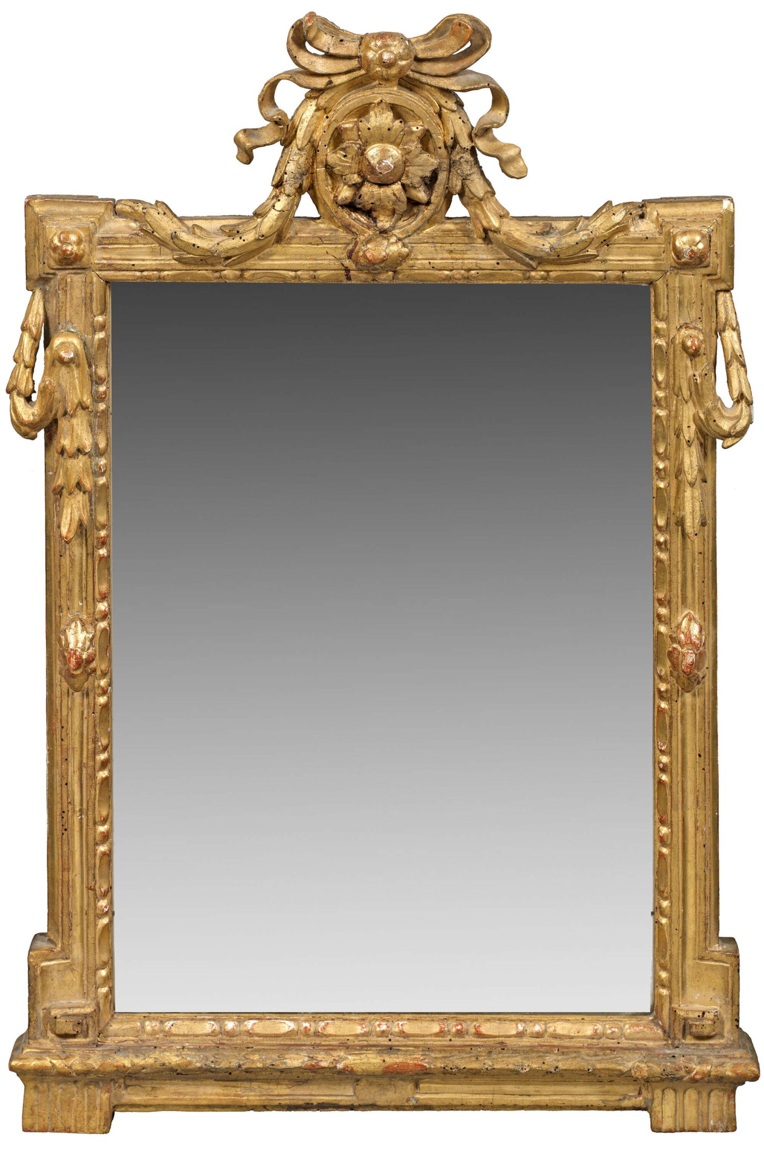 Louis XVI-Wandspiegel Holz, geschnitzt, gefasst und vergoldet. Hochrechteckige, profilierte und teilw. verkröpfte Spiegelrahmung. Durchbrochen gearbeiteter, teilw. rep. oberer Abschluss in Form eines von Lorbeerfestons umgebenen Blütenmedaillons mit Schleifenbekrönung. 65 cm x 43 cm