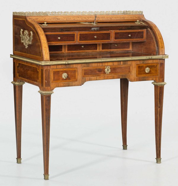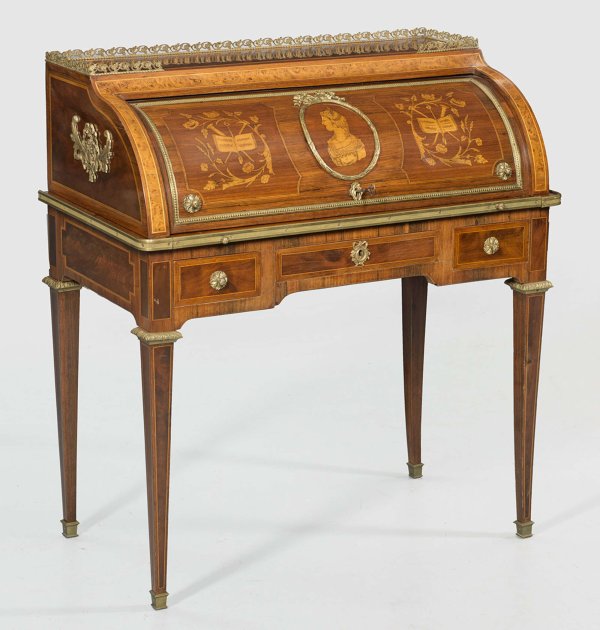 Louis XVI- Zylinderbureau Mahagoni und Palisander, furniert sowie Einlagen aus unterschiedlichen Edelhölzern. Gerader, dreischübiger Zargenkasten auf hohen, konischen Beinen. Oberhalb ausziehbare Arbeitsfläche mit bombiertem Zylinderverschluss. Dahinter gestaffelte Facheinteilung. Durchbrochen gearbeitete Galerierahmung. Schauseitig breit gerahmte Furnierfelder sowie intarsierte Attribute der Musik. H. 104 cm. 95 cm x 52 cm.