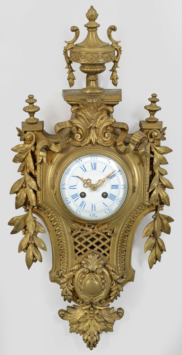Louis XVI-Carteluhr Bronze. Balusterförmiger Korpus aus Gitterwerk und Zungenfries, umgeben von üppigem Lorbeer mit großer Vasenbekrönung. Verglastes Zifferblatt. Pendulenwerk mit Pendelfeder sowie Halbstundenschlag auf Glocke. Pendel fehlt. H. 63 cm.