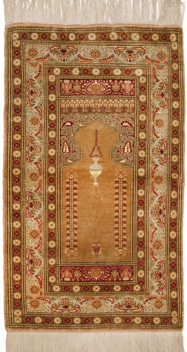 Kayserie-Seidenbrücke mit Metallbroschur Türkei. Mitte 20. Jh.; Seide auf Seide mit Metallbroschierung. Feine Knüpfung. Beigefarbene Gebetsnische mit Ampelmotiv. Umlaufend breite blaugraue Bordüre aus Palmetten und Blattwerk, begrenzt von Nebenbordüren aus Blütenrosetten. 100 cm x 59 cm.