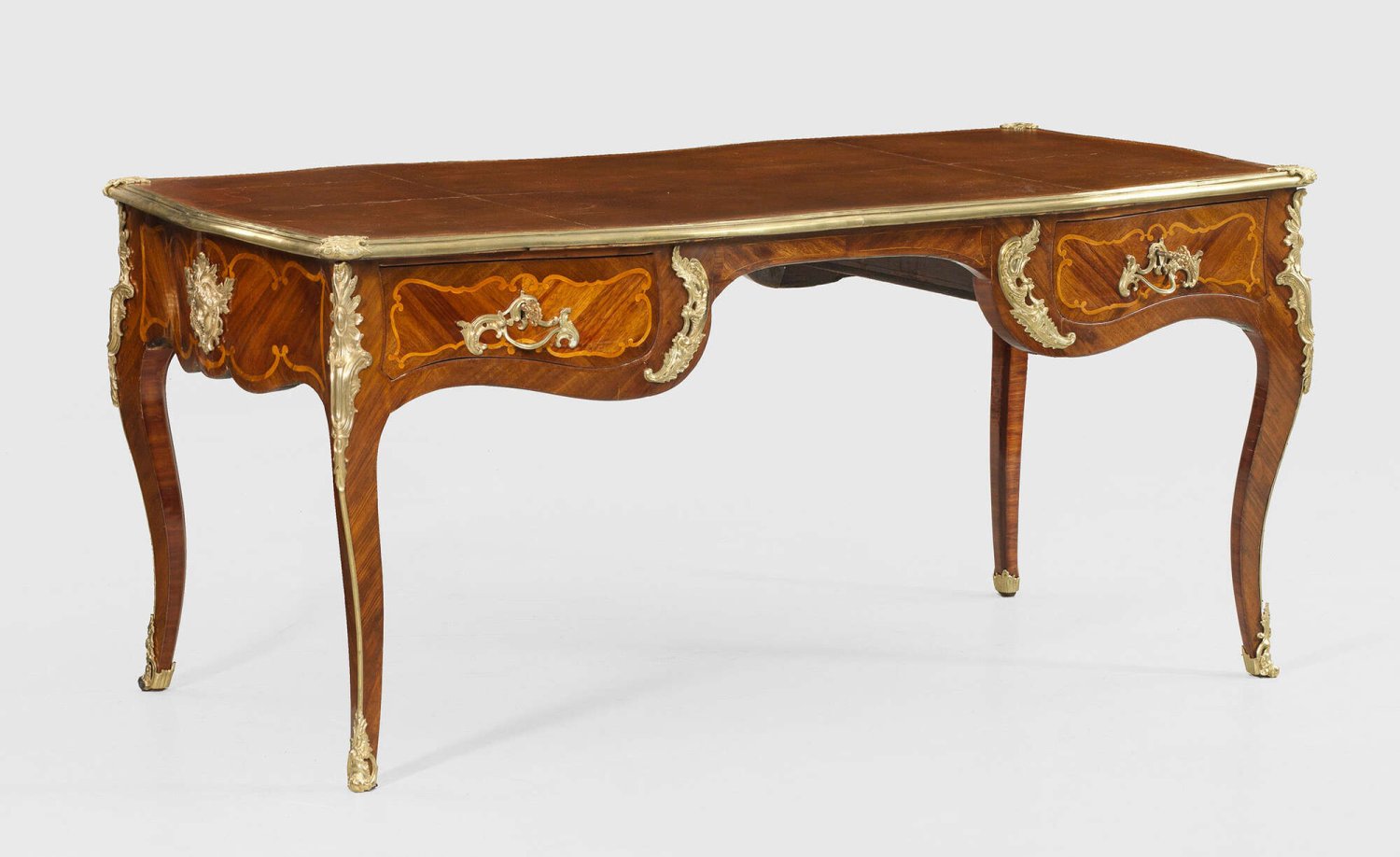 Louis XV-Bureau plat von Pierre Roussel Palisander und Rosenholz, teilw. auf Eichenholz, furniert. Allseitig bombierter Korpus, flankiert von ausgezogenen Ecklisenen, in hohe, elegant geschwungene Beine übergehend. In der gegliederten Front geschweiftes Kniefach und zwei Schubladen sowie rückseitig entsprechende Blendschubladen. Allseitig breit gerahmte, gespiegelt angeordnete Furnierfelder, von Bandeinlagen begrenzt. Korrespondierende, gering überstehende, profilgerahmte Deckplatte mit schokoladenbrauner, goldgeprägter, rest. Ledereinlage. Fein gearbeitete Applikationen aus Rocaillen, Blattkartuschen und erhaben reliefierten Maskarons. Schlagstempel P. Roussel. H. 74,5 cm. 164 cm x 81 cm.