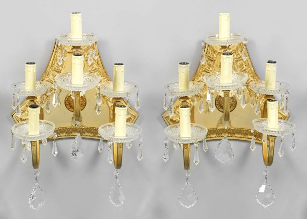 Paar dekorative Wandlampen 6-flg.; Messing sowie farbloses Kristallglas. Flaches, konkav eingezogenes Wandschild mit umlaufendem Palmettenfries als Träger für paarweise, gestuft angeordnete Leuchterarme mit zylinderförmigen Tüllen. Prismenbehang. Elektrifiziert. H. 52 cm.
