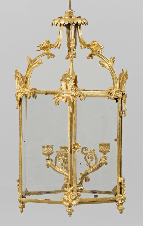 Kleine Louis XV-Deckenampel 3-flg.; Bronze, vergoldet sowie farbloses Glas. Hexagonaler Korpus aus schmalen Streben und Stegen mit applizierten Rocailleelementen. Hoch aufgeworfener pagodenförmiger oberer Abschluss aus schlanken Blattvoluten. In der Mitte schmaler Schaft mit stark geschwungenen Leuchterarmen und vasenförmigen Tüllen. H. 50 cm. D. 32 cm.
