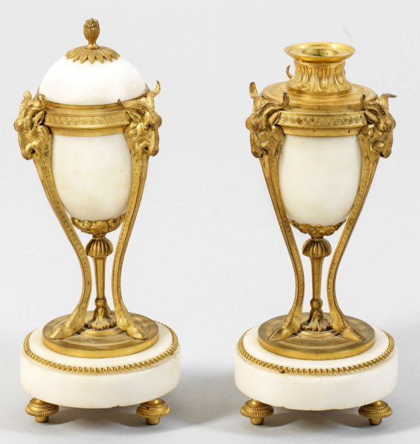 Paar Louis XVI-Cassolettes 1-flg.; Bronze, vergoldet und Alabaster. Über gestuft ansteigendem Rundsockel mit Perlfries geschwungene Streben mit reliefplastischen Bocksköpfen als Träger für vasenförmigen Korpus mit gewölbtem oberen Abschluss bzw. Tülle mit Zungenfries. H. 23 cm -25 cm.