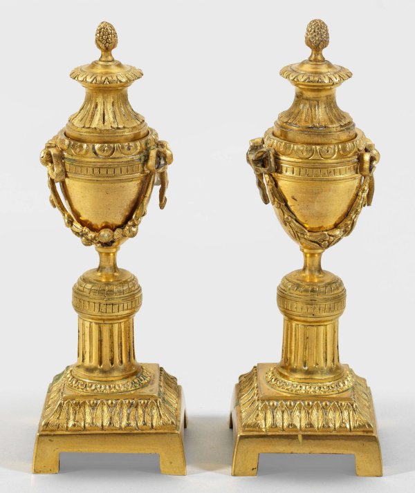 Zwei Louis XVI-Cassolettes 1-flg.; Bronze, vergoldet. Kannelierter Säulenschaft als Träger für gestrecktes Vasenelement mit herausnehmbarer Tülle sowie umlaufenden Festons mit Schleifenbekrönung. Unterhalb gestuft ansteigender Sockel mit Palmettenfries. Teilw. rep.; H. 19,5 cm - 22,5 cm.