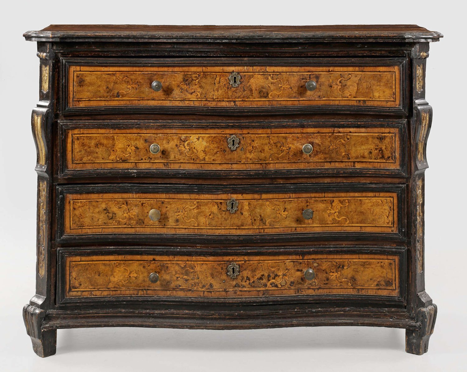 Große Italienische Barock-Cassettone Nussbaum, massiv, teilw. ebonsiert, geschnitzt, gefasst und vergoldet bzw. schauseitig furniert. Gerader, querrechteckig angelegter Korpus mit kassettierten Seitenwänden, flankiert von schräggestellten, volutenförmigen Ecklisenen auf schmaler Profilzarge und gekanteten Füßen. In der gegliederten Front vier breite, leicht bombierte Schubladen mit eingelegten Volutenmotiven. Korrespondierende, profilierte Deckplatte. H. 107 cm. 143 cm x 62 cm.