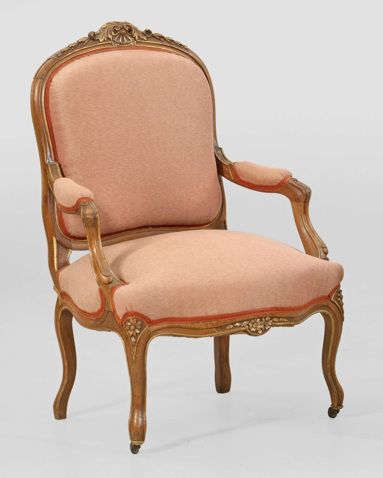 Louis XV-Salonsessel Nussbaum. Passig geschweifte Zarge auf geschwungenen Beinen mit Rollen. Kurze Stütze für schmale Armlehnen sowie schildförmige Rückenlehnenrahmung mit blattreliefiertem oberen Abschluss. Sitz-H. 47 cm.