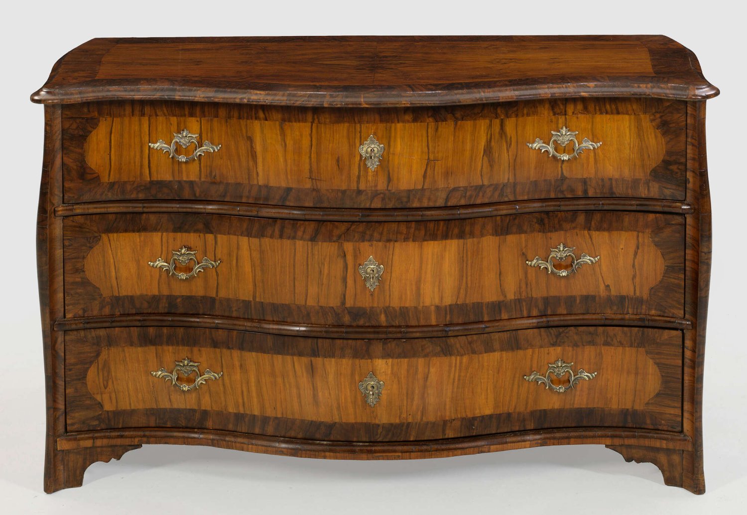 Große Louis XV-Kommode Nussbaum, furniert. Gerader, querrechteckig angelegter Korpus, flankiert von schmalen, weit ausgezogenen Ecklisenen. In der gegliederten Front drei breite, geschweifte Schubladen. Passig geschweifte, profilierte Deckplatte. Rest. mit Erg.; H. 79,5 cm. 136 cm x 63 cm.