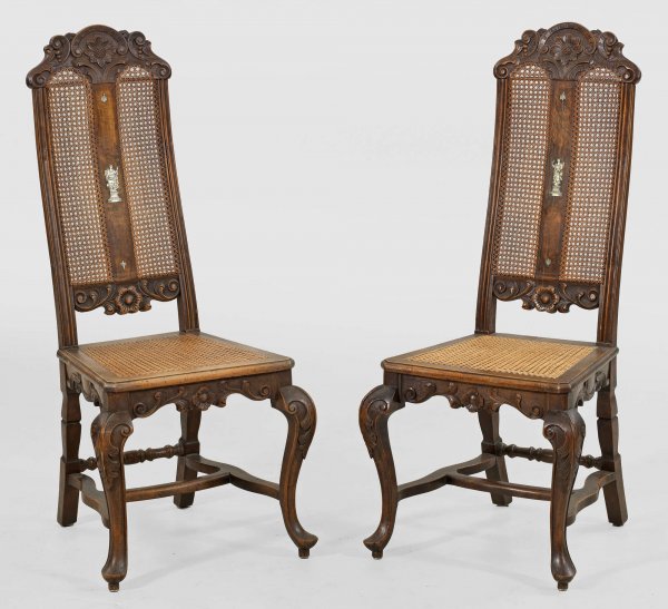 Paar Barock-Tafelstühle Nussbaum, teilw. reliefplastisch geschnitzt. Trapezförmige Zarge auf stark geschwungenen Volutenbeinen, unterhalb durch geschweifte Stege verbunden. Hohe, leicht zurückschwingende Rückenlehnenrahmung mit breitem Mittelsteg sowie geschweiftem oberen Abschluss aus Voluten. Sitzfläche und Lehne aus Rohrgeflecht. Sitz-H. 48 cm.