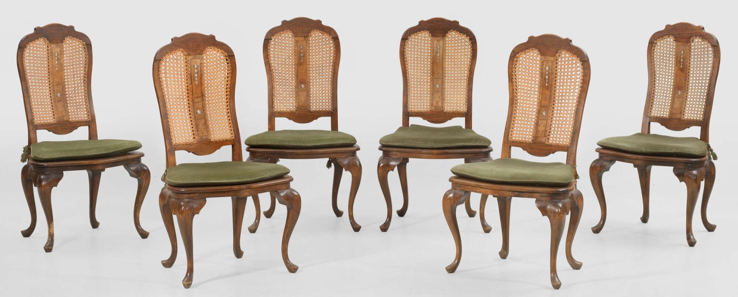 Satz von sechs Barock-Stühlen Nussbaum. Passig geschweifte Zarge auf stark geschwungenen Volutenbeinen. Leicht zurückschwingende Rückenlehnenrahmung mit breitem Mittelsteg und gewölbtem oberen Abschluss. Sitzfläche und Lehne aus Rohrgeflecht, teilw. besch.; Sitz-H. 47 cm.