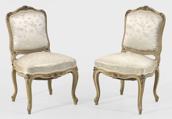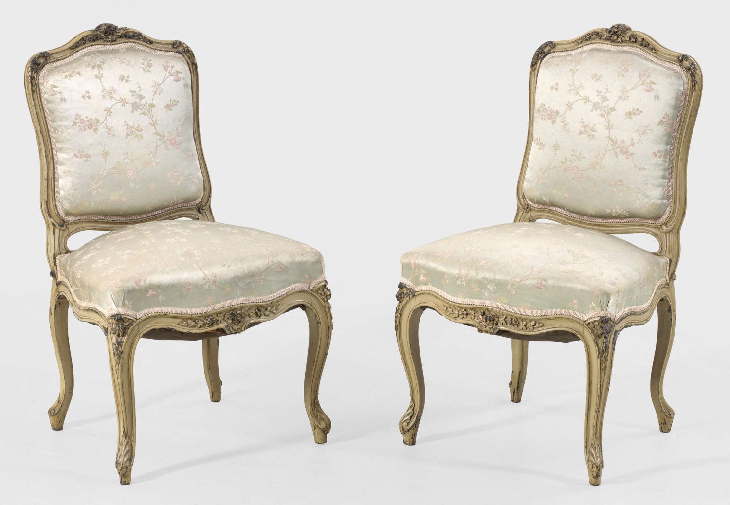 Paar Louis XV-Salonstühle Holz, cremefarben und dunkelgrau gefasst. Passig geschweifte Zarge mit erhaben reliefierten Volutenmotiven auf geschwungenen Beinen. Korrespondierende, schildförmige Rückenlehnenrahmung. Gepolstert und bezogen. Sitz-H. 47 cm.