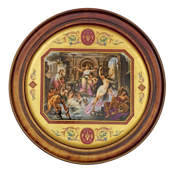 Große Schauplatte im Alt-Wiener Stil Leicht gemuldete Tondo-Bildplatte aus Porzellan. Zentrale, in Goldgrund ausgesparte und von Ornamentbändern gerahmte, achteckige Reserve, darin antikisierende, szenische Darstellung einer Götterversammlung mit Landschafts- und Architekturkulisse. Vor einem Ruinenbogen thronende, von Wasser umgebene Minerva mit beigeordnetem Attribut der Eule als Symbol der Weisheit. Flankiert von verschiedenen Figuren der griechischen und römischen Mythologie. Zur rechten Seite auf einem Panther sitzende Ariadne, Tochter des kretischen Königs Minos bzw. die auf einer Kugel stehende Glücks- und Schicksalsgöttin Fortuna. Zur linken Seite zwei auf einem Delphin reitende Tritonen sowie Terpsichore mit Lyra, die Muse des Tanzes. Umlaufend Ovalmedaillons und quadratische Reserven sowie Ornamentbordüren mit Reliefgolddekor auf bordeauxrotem Fond sowie stilisierte Akanthusblattvoluten. Feine polychrome Malerei. Reliefgolddekor. Sign. "E.(?) Forster". Rücks. Bez. "Märchen". Profilierter, gestuckter und braun gefasster Holzrahmen. Manufakturmarke. Ges.-D. 50 cm. Platten-D. 42 cm.