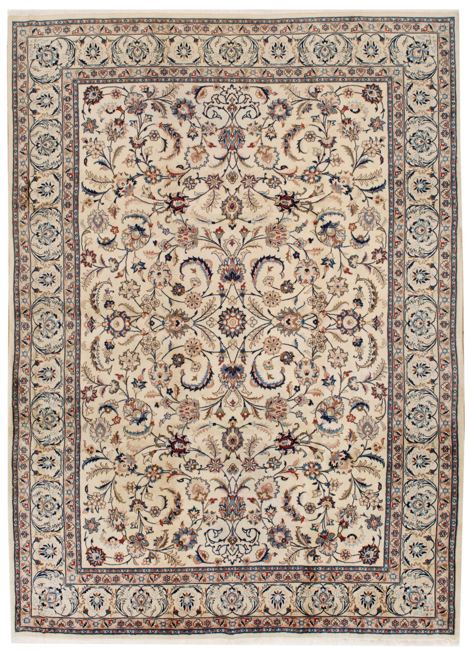 Großer Isfahan-Teppich Persien. Wolle auf Baumwolle. Im beigefarbenen Innenfeld flächendeckende Musterung aus üppigen Palmettenranken. Umlaufend breite korrespondierende Bordüre aus Blattwerk und Palmettenblüten in korrespondierender Farbigkeit, flankiert von schmalen Nebenbordüren. 345 cm x 246 cm.