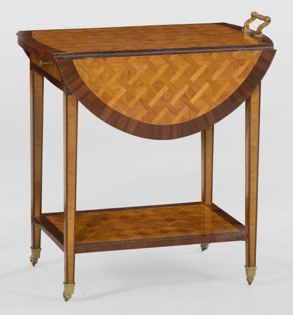 Barwagen im Louis XVI-Stil Mahagoni und Rosenholz, furniert. Gerader, einschübiger Zargenkasten auf konischen Vierkantbeinen mit Rollen, unterhalb durch Ablagefach verbunden. Gerundete Deckplatte mit aufstellbaren Seiten. H. 79 cm. 77 cm x 47/92 cm.
