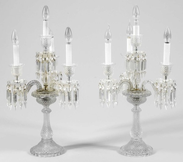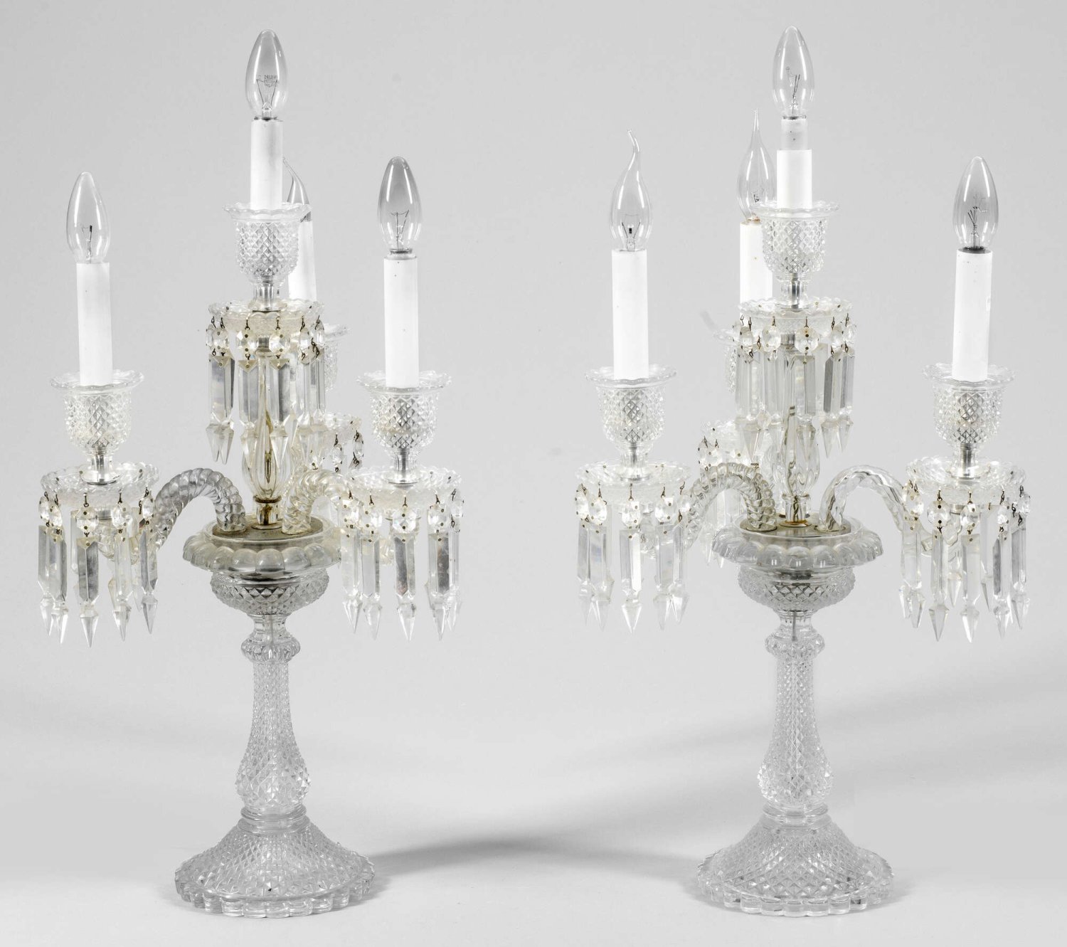 Paar Girandolenlampen von Baccarat 4-flg.; Farbloses Kristallglas. Über geschweift ansteigendem, rosettenförmigem Rundfuß mehrfach gegliederter Balusterschaft. In der Mitte davon ausgehend stark geschwungene, in sich gedrehte Leuchterarme mit vasenförmigen Tüllen. Behang aus facettierten Prismen. Herstellerzeichen. Elektrifiziert. Ges.-H. 70 cm.