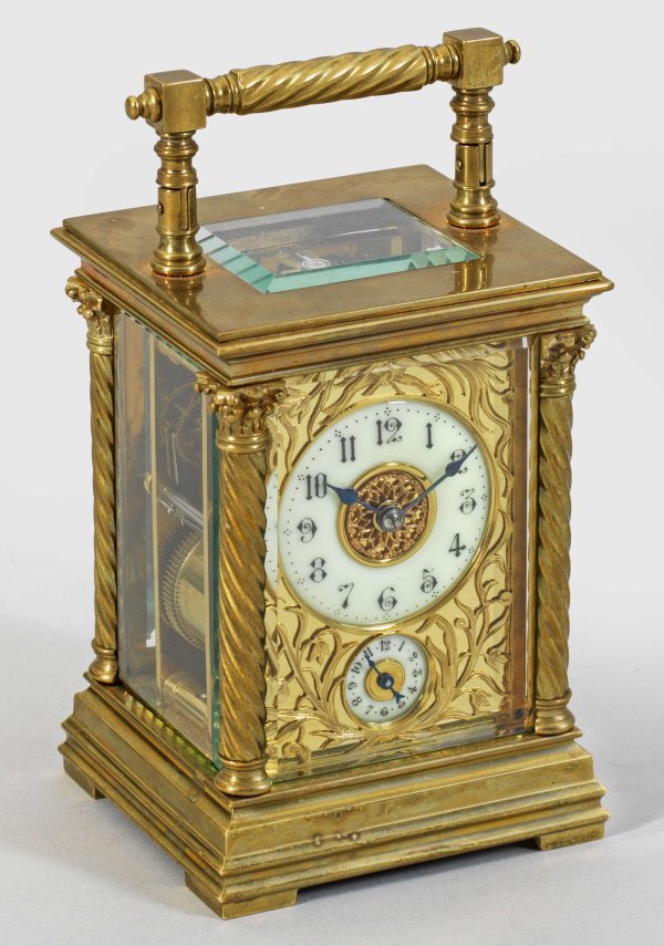 Reiseuhr Messing. Allseitig facettverglaster Korpus, flankiert von gedrehten Säulen auf Profilsockel. Scharnierter Griff. Ziffernring mit arabischen Zahlen sowie korrespondierender Einstellung für Wecker. Werk mit Echappement, Halbstundenschlag auf Tonfeder sowie Weckfunktion. Ges.-H. 16 cm.