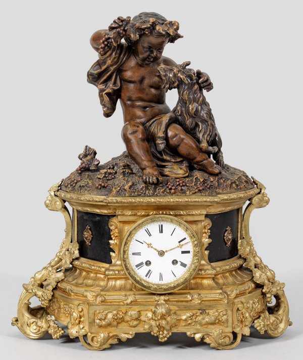Napoleon III-Kaminuhr Zinkguss, rotbraun lackiert bzw, teilw. vergoldet. Bombiertes Uhrengehäuse auf hohem Sockel mit Zungenfries und Weinlaub, flankiert von Volutenspangen. Verglastes, besch. Zifferblatt. Pendulenwerk mit Pendelfeder sowie Halbstundenschlag auf Glocke. Vollplastische Bekrönung in Form eines Bacchantenknaben. H. 48 cm. 41 cm x 16 cm.