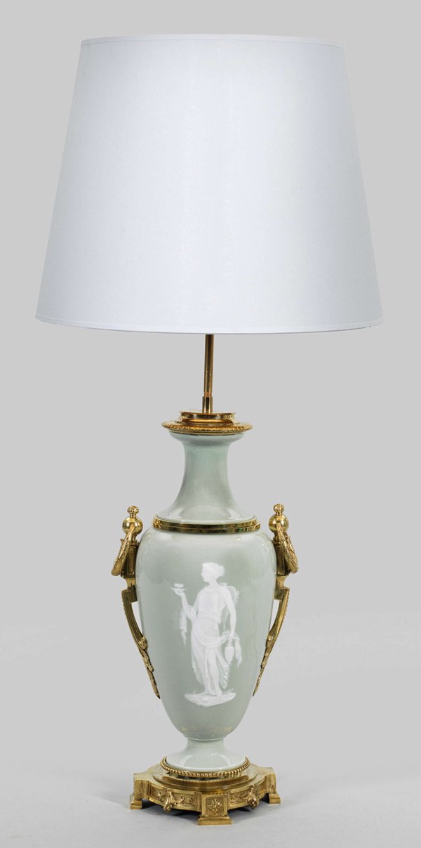 Prächtige Tischlampe mit Pâte-sur-pâte-Malerei und französischer, vergoldeter, reliefplastisch ornamentierter Bronzemontierung. Porzellan, seladongrüne Glasur. 1-flg.; Vierfach ausgezogener, von reliefierten Rosetten, Weinreben und Perlfries umzogener Sockel mit amphorenförmigem, seladongrün glasiertem Porzellankorpus. Seitlich blattreliefierte Griffe mit Ringhenkeln. Beidseitig der Wandung leicht erhabene Darstellung der griechischen Göttin Hebe bzw. eines arabesken Rankenornaments in weißer, sog. Pâte-sur-pâte-Malerei. Konischer, mit hellem Stoff bezogener Lampenschirm. Nachträglich elektrifiziert. Ges.-H. 84 cm. Vasen-H. 38 cm.