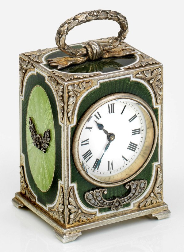 Reiseuhr im Stil von Karl Fabergé. Silber, teilw. vergoldet sowie grün und weiß emailliert. Hochrechteckiger Korpus, an den Ecken besetzt mit reliefplastischen Blättern. Auf der Seitenwandung sowie rückseitig florale Applikationen, besetzt mit Diamantrosen. Weiß emailliertes Zifferblatt mit römischen Ziffern. Französisches Uhrwerk bez. L. Leroy & Cie. Paris, Werk-Nr. 19345. Originaler Lorbeerkranz-Schlüssel für Werk und Zeiger. Gest. Kokoschnik 88; AH. H. mit Bügel 8,5 cm.