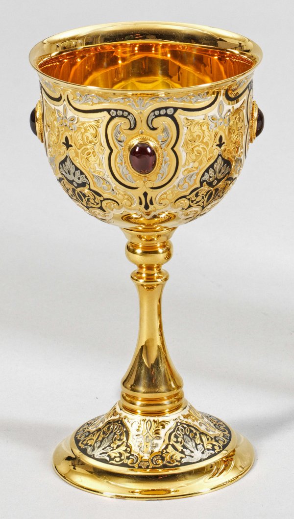 Abendmahlskelch mit Original-Holzschatulle. Messing, vernickelt, versilbert und vergoldet. Konischer Schaft über flachem Stand. Weit ausschwingende Kuppa besetzt mit vier Rubincabochons sowie flächendeckend fein floral graviert nach historischem Vorbild. H. 19 cm.