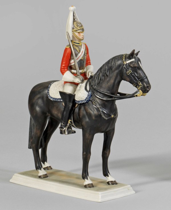 Britischer Soldat zu Pferd Biskuitporzellan. Auf rechteckigem, profiliertem Sockel, zu Pferd sitzender Soldat der Britischen Leibgarde in Uniform mit Schwert. Polychrome Malerei. Entw. Gerhard Bochmann. Entw.-Bez.; Manufakturmarke. H. 30,5 cm. 23 cm x 10 cm.