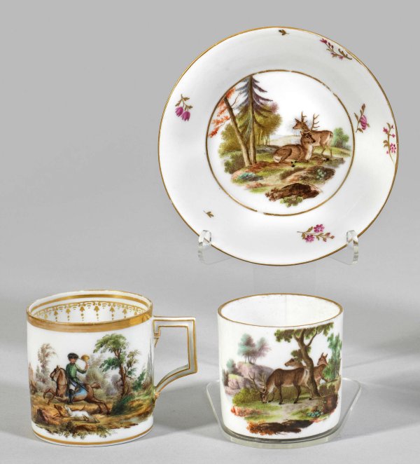 Zwei Tassen mit jagdlichen Motiven Teilw. mit Untertasse. Zylindrischer Korpus mit Ohren- bzw. Henkel "á la greque". Farbige Darstellung eines Reiters mit Horn bei der Jagd eines Hirsches bzw. Hirschgruppe in polychromer Malerei. Teilw. Golddekor. Teilw. besch./minim. rest.; Schwerter- und Manufakturmarke. H. 6 cm - 6,5 cm.