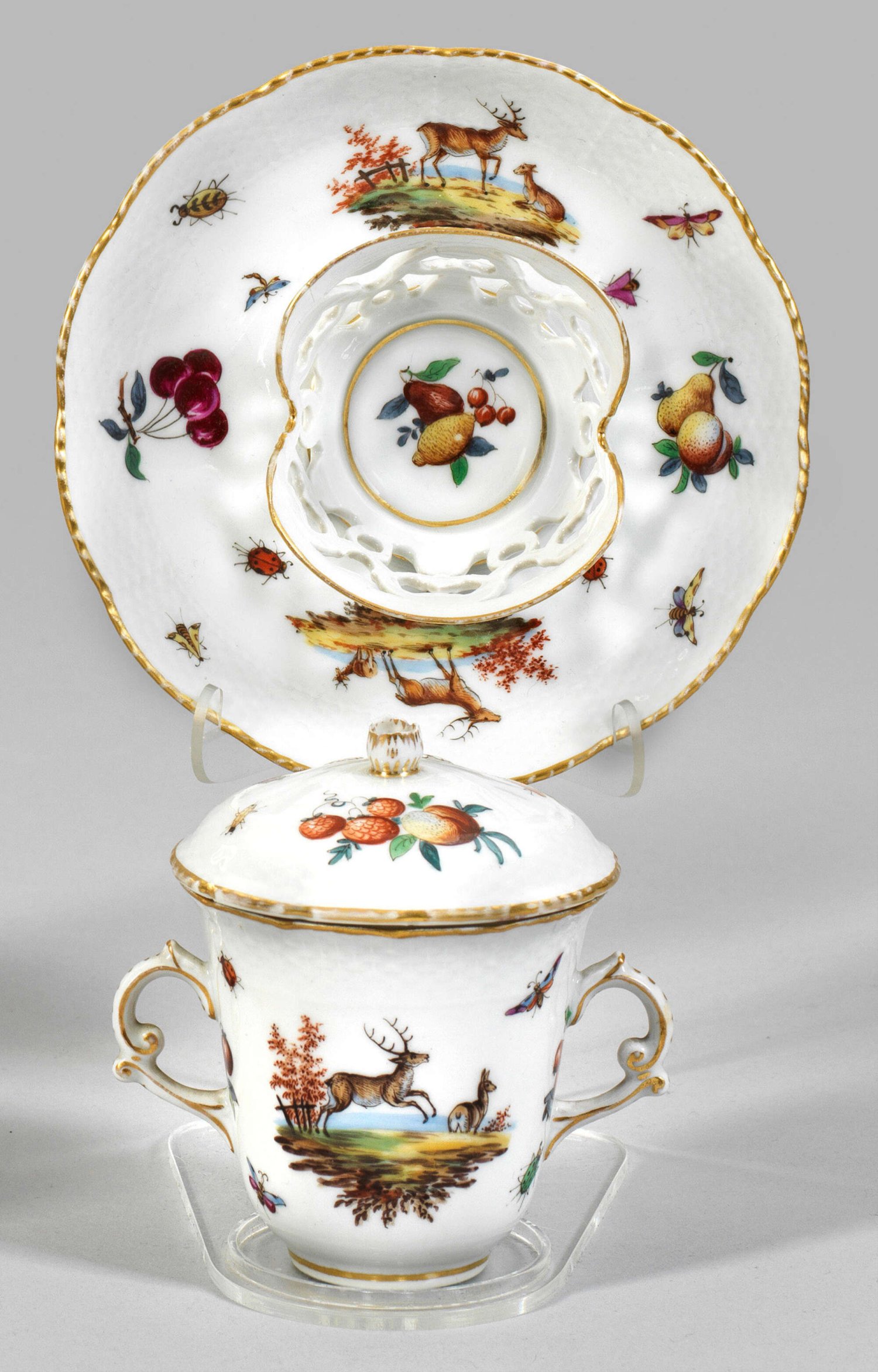 Kinder-Trembleuse Becherform mit Doppelhenkel und Deckel sowie Gittereinsatz. "Ozier"-Reliefdekor. Farbenprächtige Malerei mit Hirschpaar, Insekten und Früchten. Knauf best.; Manufakturmarke. H. 7 cm.