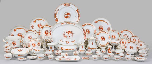 87-tlg.; Kaffee-, Mokkakanne, 8 Kaffee-, 8 Mokkatassen mit Untertassen, 2 Zuckerdosen, 2 Sahnegießer, 7 Kuchen-, 6 Vorspeisen-, 14 Speise- und 8 Suppen-, 4 Salat-, 4 Dessertteller, Königskuchen-, Torten-, Bratenplatte, 2 Beilagen-, 3 Gebäck-, Pralinenschale, 2 Konfektschälchen, Bonbonniere, Suppenterrine, Sauciere, Stövchen mit Teelichthalter, 2 Kerzenleuchter, 2 Vasen, Glöckchen, Cachepot. "Reicher Drache" -Dekor in eisenroter, Gold gehöhter Camaieumalerei. Goldstaffage. Beigabe: 3 Kaffeetassen, Dessertteller, Vase und Salzschälchen mit abweichendem Dekor. Minim. best.; Schwertermarke. Kaffeekannen-H. 24 cm. Bratenplatten-Maße 52 cm x 39 cm.