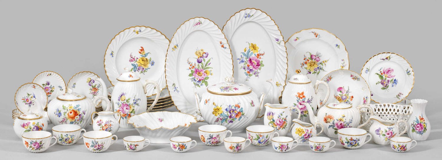 Speise-, Tee- und Mokkaservice für sechs Personen 54-tlg.; Große Tee-, kleine Teekanne, 2 Mokka-, 2 Milchkannen, Sahnegießer, Zuckerdose, 6 Teetassen mit Untertassen, 6 Mokkatassen mit Untertassen, 6 Gebäckteller, 6 Plätzchenteller, Gebäckschale, Brotkorb, 2 Vasen, 2 Zuckerdosen, Gemüseschale, Deckelterrine, 2 Fleischplatten, 6 flache und 6 Suppenteller. Bemalt mit Blumenbuketts und Streublumen. Goldkante. Manufakturmarke.