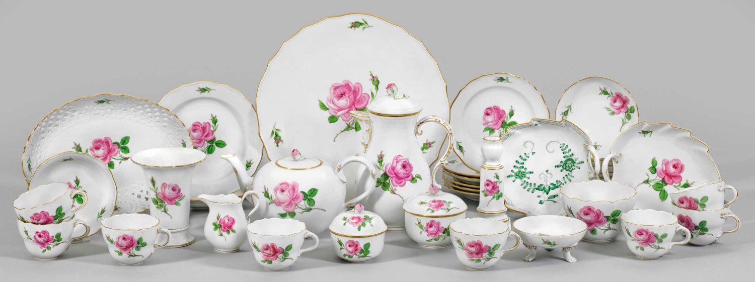 Restservice 30-tlg.; Tee- und Kaffeekanne, gr. und kl. Zuckerdose, Sahnegießer, 8 Tassen mit Untertassen, 6 Kuchenteller, 2 Frühstücksteller, runde Kuchenplatte, ovale Durchbruchschale, 2 kl. Schalen, Kerzenhalter, Fußschale, Blattschale, Übertopf und Vase. Blumenmalerei in grün- und rosafarbenen Tönen mit Goldstaffage. Schwertermarke. Beigabe: Blattschale mit grüner Indianischer Blume. Schwertermarke.