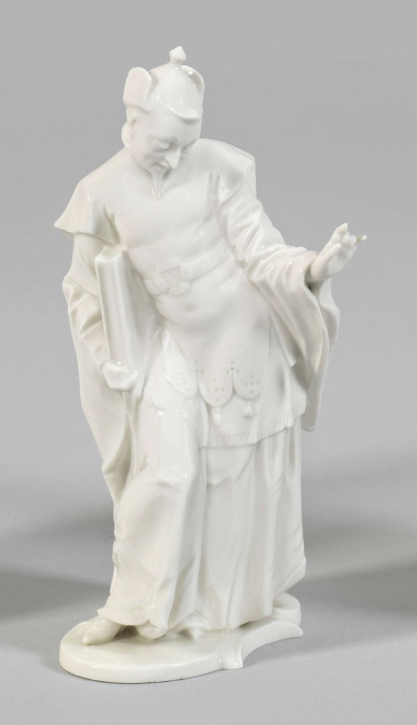 "Chinesischer Gelehrter". Originaltitel Weißporzellan. Stehender Chinese in traditioneller Kleidung, unter dem rechten Arm ein Buch haltend. Entw. Franz Anton Bustelli. Minim. besch.; Manufakturmarke. H. 19,5 cm.