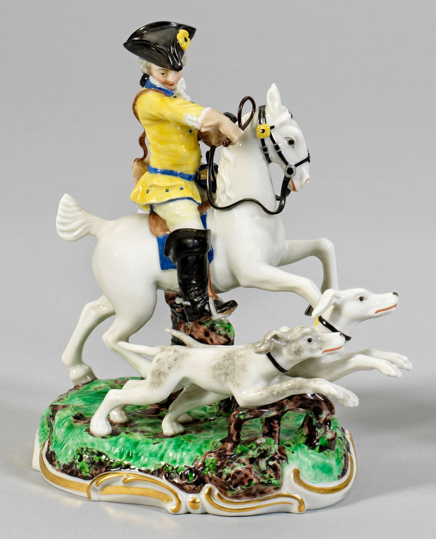 Reiter aus der Gelben Frankenthaler Jagd Auf rocaillenförmig gerahmtem Natursockel, zu Pferd sitzender Jäger in Begleitung von zwei Hunden. Polychrome Malerei mit Goldkonturierung. Entw. Karl Gottlieb Lück. Eingepresste Manufakturmarke. H. 18 cm.