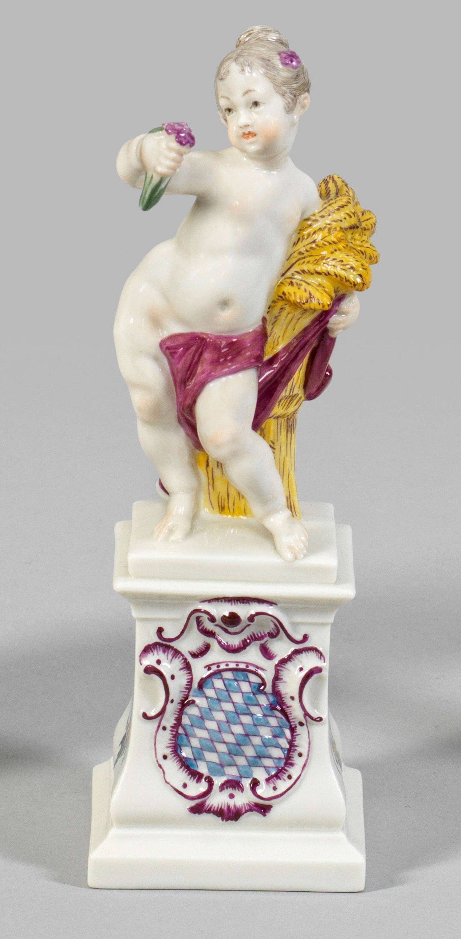Putto als Ceres Aus einer Jahreszeitengruppe. Auf Postament stehender Putto mit Getreidegarbe im Arm, den Sommer darstellend. Polychrome Malerei. Entw. Franz Anton Bustelli. Manufakturmarke. H. 16,5 cm.