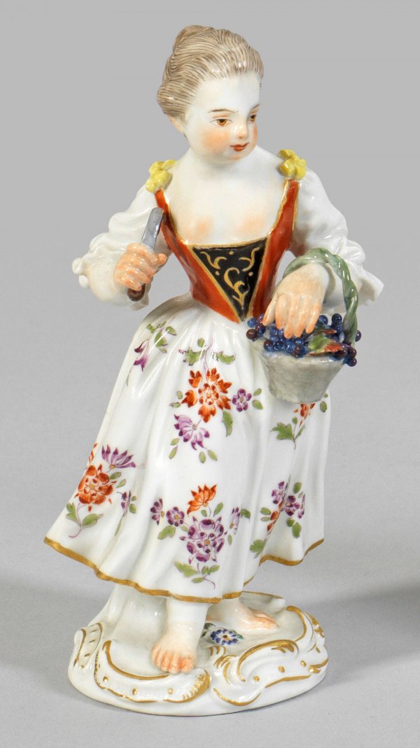 Gärtnerkind Stehendes Mädchen in sommerlicher Kleidung. In der rechten Hand eine Sichel, in der Linken einen Traubenkorb haltend. Polychrome Malerei mit Goldkonturierung. Schwertermarke. H. 13,5 cm.